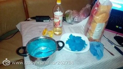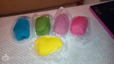 — Налейте лимонный сок в стакан, долейте воды до верху. — Смешайте муку с солью на сковороде. К ним вылейте воду и масло. — Добавьте краситель. Можно использовать растворимые напитки, типа «юпи». Так кроме цвета у Вас будет ещё и запах. — Варите на среднем огне примерно 5 минут, до тех пор пока масса не затвердеет. — Снимите с огня и слегка разомните массу руками.