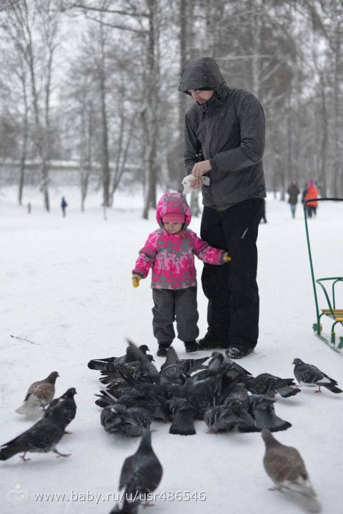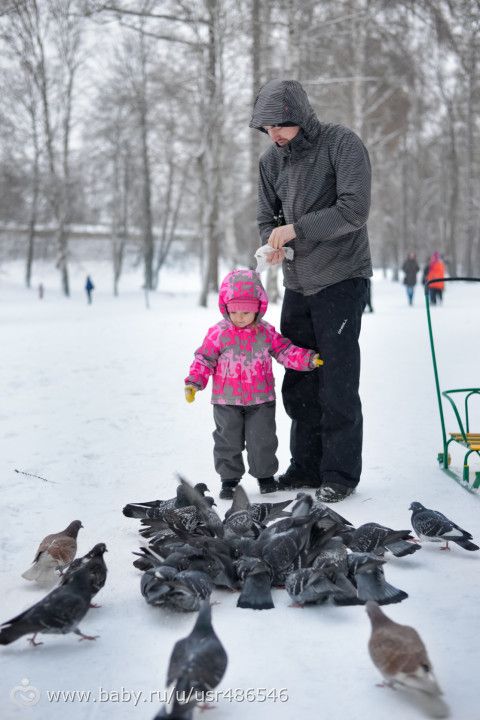 Фотографии немного темноваты, это легко можно исправить обработкой, зато снег не потерял своей структуры. Если бы при съемке камера получила больше света, снег превратился бы в одно сплошное белое нечто. Выдержка у меня 1/160 и даже с такой длиной видно, что у голубей смазаны крылья. С какой же скоростью они ими шевелят?!!
