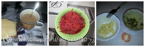 завтрак-каша на воде и кофе, обед-суп с фрикадельками, ужин-винегрет и кефир ближе к ночи