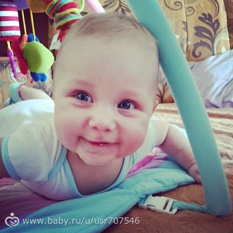 Переворачиваемся на живот,на спину редко, ползаем вокруг себя , хорошо подолгу играем на животе. Один? второй уже виднеется. Пока остаемся на чистом ГВ.