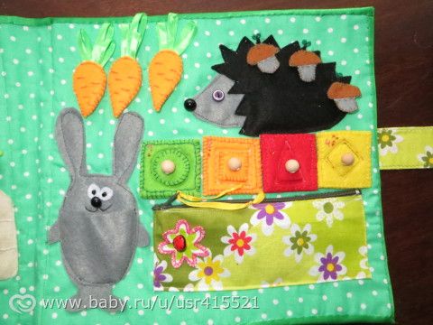 На следующей страничке- зайчик ( у зайчика в ушках бисер) который очень любит есть морковку, для этого у него есть карманчик куда он может положить морковку, морковка на липучке. рядом стоит ежик, ежик шуршит и он собрал грибочки, грибочки на крючках. Также на этой страничке есть сортер и кармашек (куда можно сложить детали от сортера, грибочки, тучку или солнышко) на кармашке сидит божья коровка, она на шнурочке, ее можно вытаскивать.