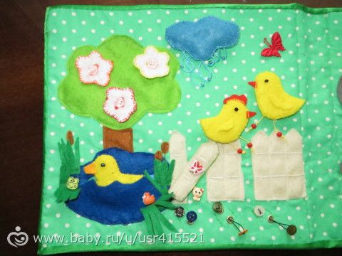 на второй страничке — дерево с цветочками на пуговичках, солнышко на липучке можно заменить на тучку с дождиком, в озере плавает уточка, она передвигается из стороны в сторону, с одной стороны озера спряталась лягушка, с другой- маленькая уточка. Рядом стоит забор, на заборе сидят цыплята они на кнопочках, в заборе спряталась кошечка, возле забора так называемые червячки, цыплята могут спуститься с забора и подкрепиться.