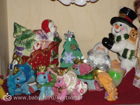 Какой же Новый год без елочки сказали они и нарядили маленькую деревянную елочку из конструктора пайетками, приклеив их на пластилин. Получилась настоящая праздничная новогодняя елочка. Поздравить лошадок пришли и снеговички — солонка и перечница с кухни. Маленький Дед Мороз тоже не забыл порадовать малышей.