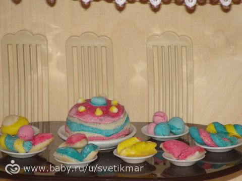 Потанцевав лошадки отправились на пир. Специально для них мы подготовили много-премного сладостей из соленого теста. В этот раз я решила не красить соленое тесто после просушки (терпения нам не хватает), а покрасить тесто сразу пищевыми красителями. Мы налепили с Сашей конфет, рулетиков, ватрушек, булочек, хот-догов и торт. Ну, как налепили — лепила я, а Саша руководила.