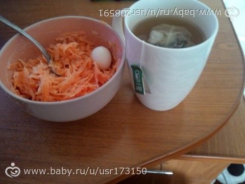 Обед: тёртая морковь с чесночком и сметаной 15%, перепелиное яичко, чай)