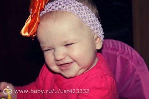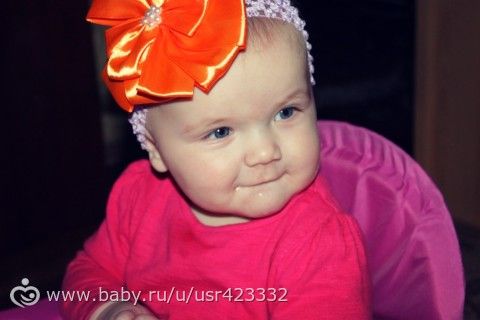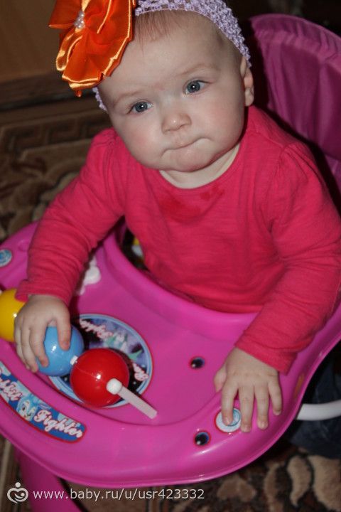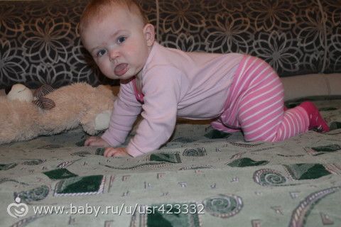 Из умений: переворачивается на живот и обратно; ползать все также пытается, но пока только стоит на коленках; говорит уже слоги типа «па, ма, ба», а в последнее время говорит «татататата», как бы разговаривает, с таким серьезным лицом, сама пока не садится, но если посадить, то сидит хорошо.