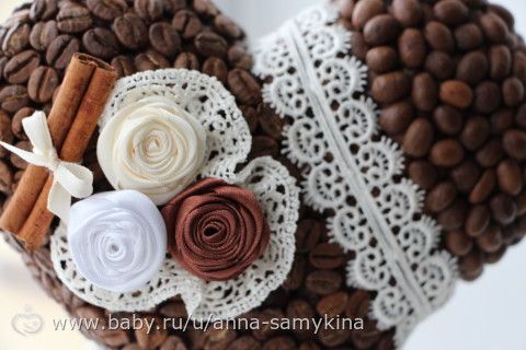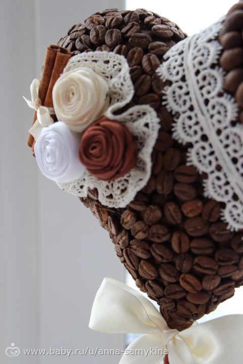 Назвала я его «Кофейное безумие»! Сделан из натуральных кофейных зерен, кружева, атласных лент и корицы, собственноручно привезенной из жаркой Доминиканы! Запах этого топиария сводит с ума! Замечательный подарок на день всех влюбленных!