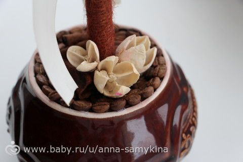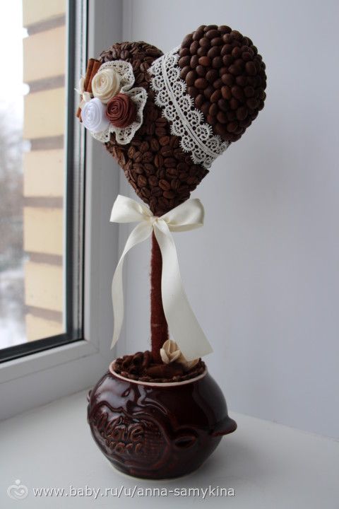 В своем предыдущем посте я рассказывала как во мне зародилось мое новое хобби! На новогодних топиариях я, конечно же, не остановилась и начала творить подарки ко дню всех влюбленных! Кофейный топиарий я делала впервые, на мой взгляд получилось весьма милое деревце, которое будет радовать ни один год!