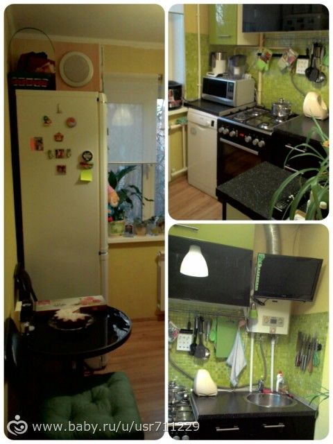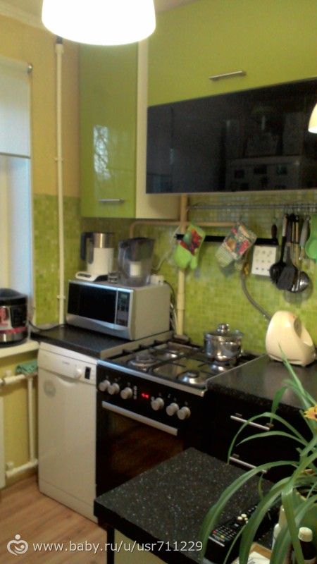 Наверху 3 шкафчика. Вертикальный зеленый, и над плитой 2горизонтальных. Посуда в нижнем горизонтальном. А ещё есть шкафчик между плитой и раковиной. Там кастрюли, сковородки, формы, контейнеры:-)