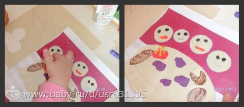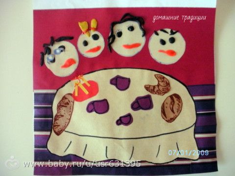 № 78 Мы все большие праздники последние года отмечаем со свекровкой. Решили изобразить наше семейное чаепитие, слева-направо: бабушка (добавили ей очки, чтоб ее как-то отличить, хотя она еще редко их носит)), Асмира с двумя хвостиками (получилось похоже больше на ушки)), мама, папа. Тортик со свечками, чашки, хлебобул.изделия