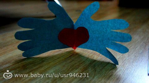 Отмечать День Святого Валентина (это ладошки сына, вырезала сама, сердечко приклеил Матвей)