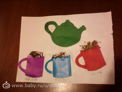 У нас в семье очень любят пить чай, вечером обязательно садимся все вместе попить чайку. Поэтому сегодня мы делали аппликацию «Чаепитие» (цветной картон, клейстер, заварка). Хотела еще кружочки всякие на заварник приклеить, но сын выразил протест, сфоткала и отдала нашу работу на растерзание.