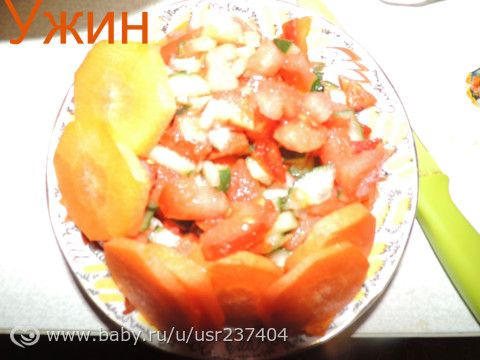 Ужин: ( на фото все размазано ) съела овощной салат и порезала колечками морковку: