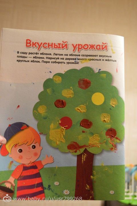 Это мы в книжке для пальчикового рисования нарисовали красные и жёлтые яблочки на яблоне, а потом ту же картинку воспроизвели из пластилина, добавив свои детали. Неведомая фигня слева от яблони — это корзинка с яблочком, а зелёные палки возле ромашки — это травка )))