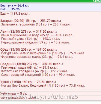 Питание адаптировано под режим тренировок (разгоняю метаболизм), спорт--3 раза аква, 3 раза тренажерка.