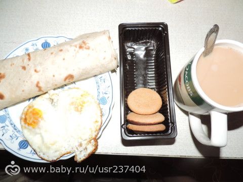 В Лаваше овощи и чуть майонеза, кажется рулет огромный, но на самом деле слой лаваша тоненький, яичница была и печенье с кофе