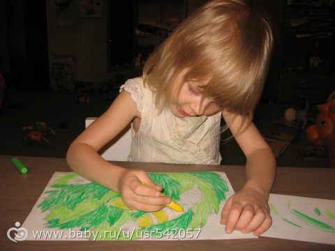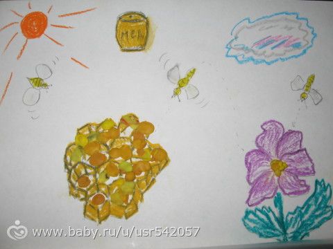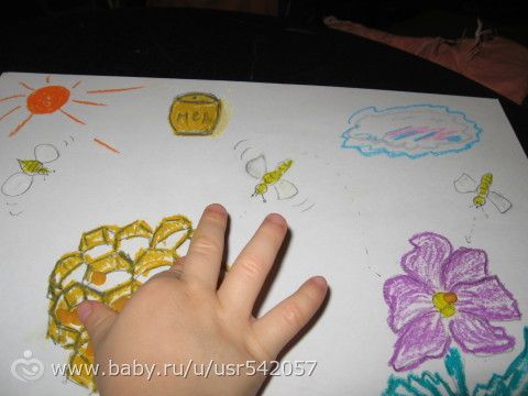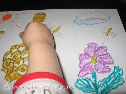 Тима сегодня весь день провел у мамы на руках. Я рисовала и комментировала рисунок, а потом он помогал пчелке переносить нектар у соты (маленькие пластилиновые шарики) и делать мед (смешивали два цвета — светло-коричневый и желтый). Тиме это занятие так понравилось, что он несколько раз просил повторения. Под конец уже лепил не смешивая. Устал, все-таки с тем-рой ребенок.