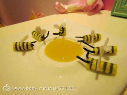 Сегодня на задание марафона было совсем мало времени, утром мы с дочкой ходили в тренажерный зал (творчество, конечно, очень хорошо, но весна уже скоро)), потом обыденные дела, а во время обеденного сна я творила кулинарный шедевр в рамках другого детского конкурса (фотки выложу по окончанию конкурса). Так что пчёлок накрутили из кусочков фетра и подвесили их на ниточки. Такой забавный рой пролетал у нас недолго)), это и понятно было как только приклеила их на ниточки), короче запутались они, мы их освободили от ниток и посадили подкрепиться мёдом, натуральным и полезным с кубанской деревни).