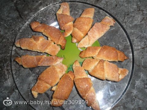 Замесить крутое тесто: 1 пачка творога, 2 яйца, 0,5 стакана сахара,1 ч. ложка соды погашено уксусом и мука. Раскатать круг и разрезать на 8 частей. Каждую часть скатываем от широкого края к узкому. Выпекать в духовке при 180 градусах.