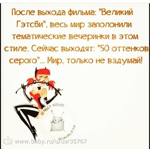 ))))))))) 13 февраля 2015 14:20 Комментарии Пожалуйста, будьте вежливы и доброжелательны к другим мамам и соблюдайте правила сообщества ПожаловатьсяСкопировать ссылку KAtrin НАСТАСЬЯ14 летАлиса6 лет Таганрог мдааа...) ты из противниц оттенков оказывается?)ПожаловатьсяСкопировать ссылку iriSka София13 лет Таганрог неееееее)))) книги мне очень понравились, просто забавляет эта активность в сетях))) ПожаловатьсяСкопировать ссылку KAtrin НАСТАСЬЯ14 летАлиса6 лет Таганрог ааа) а то я уж было подумала))) ПожаловатьсяСкопировать ссылку Наталья Игорь20 лет Алексин Клааас!!! Предыдущая статьяДЕВОЧКИ ТАГАНРОГ!ДОБАВЬТЕ МЕНЯ,У МЕНЯ НОВАЯ СТРАНИЧКАСледующая статьяфильмы, посвященные самой волнительной и пикантной теме