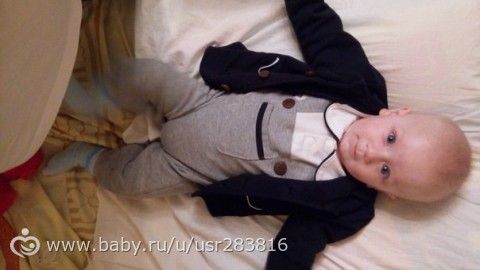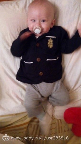 Потом пришла домой… Мама как всегда пообзывала накричала.Покормила я кроху и уложила спать.Потом завтыкала просто в комп.А когда молой проснулся решила примерить костюмчик на него.Оказался кокрас)А так то это 9-12 м)))