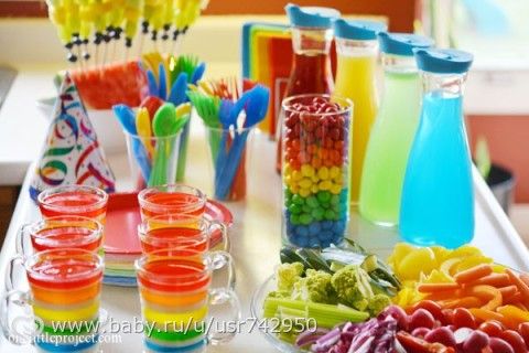 Еще можно налить разноцветные напитки по баночкам и украсить ленточками)))