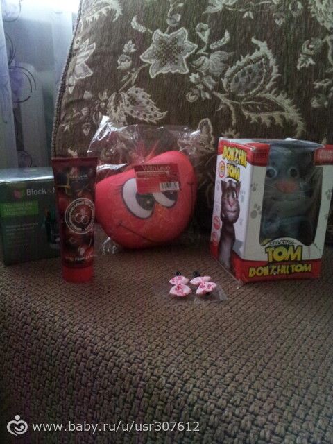 Леночка, спасибо огромное за то, что пришла, принесла массу впечатлений, эмоций. Подарки очень хорошие: крем, актуальный в нынешнюю погоду, игрушка-сердечко, меняющая форму, хорошо снимает стресс и напряжение, заколки доченьке, пусть сейчас мы их не оденем, но ближе к лету, думаю, нам будет на что их нацепить))), подставка для канц. товаров ( а то у меня вечно ручки по всей квартире валяются), ну и говорящий кот ( батарейки прикупим, посмотрим что он умеет
