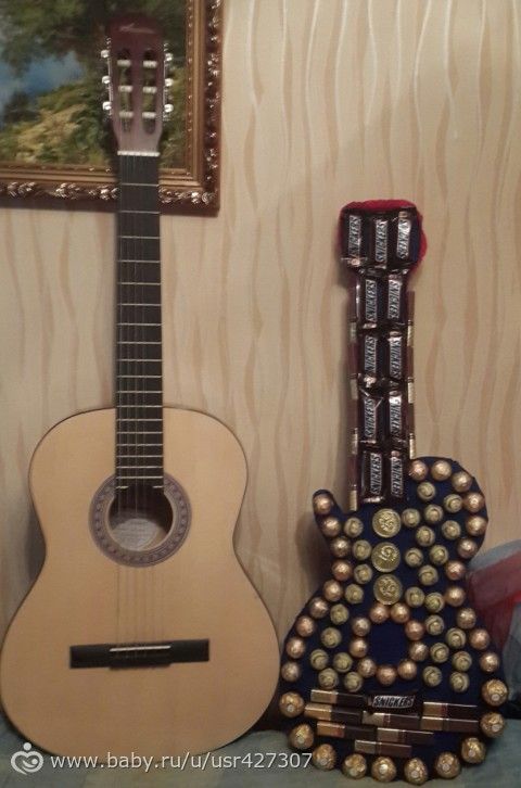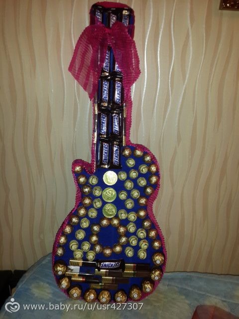 так вот… спустя практически год после рождения Зои… я решила чем то заняться-чтобы и для души было и подзаработать)) моя первая композиция из конфет -«гитара»