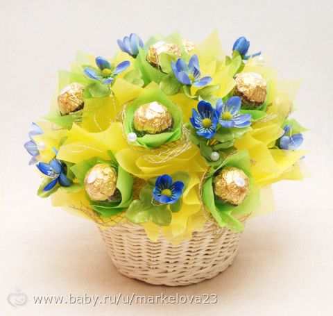 я делала в подарки) но себе нет) букеты из цветов как способ подарить конфеты, вот купите за 200 р 5 конфеток фереро и как то смотрится скушно и мало, а засунуть их в букет, уже прикольно.