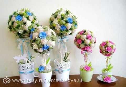 Дочке дарили букет из игрушек, я выкинула ибо нафиг пыль в доме лишняя! Букет из конфет тоже был, конфеты съели, букет в мусор. Но вот топиарий, не было у нас и пусть лучше не будет, потому как ему туда же дорога. Искусственные цветы не для моего дома! Могу еще представить из зерен кофе в качестве устранителя запахов и все,!!!