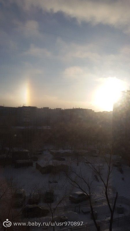 Во вторник утром над городом появилось солнце, окруженное ярким кольцом с двумя маленькими «солнцами» по бокам. Оптическая иллюзия образовалась благодаря скопившимся в воздухе кристаллам воды.