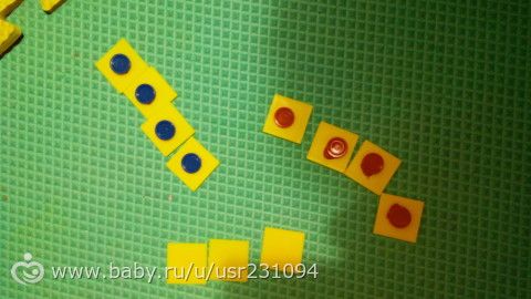 затем на квадратики я налепила разные кружки что бы отличались они. собирали кучки одинаковых: