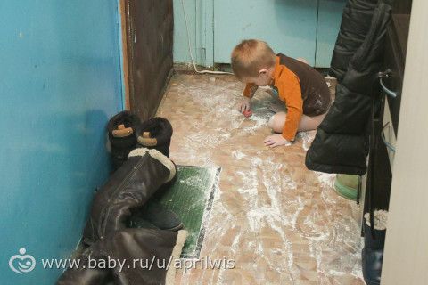 ну у нас у Яра таких фото коллекция «5 минут тишины» называется) это он в лоток к кошке лазил и там машину катал, я замучалась ругаться и дала ему баночку с мукой, что-то думаю тихо, иду на кухню, а в коридоре это!!! Наверное я бы уследила, если к Сереге бежать не надо было)ну ничего, в этом и есть ДЕТСТВО!