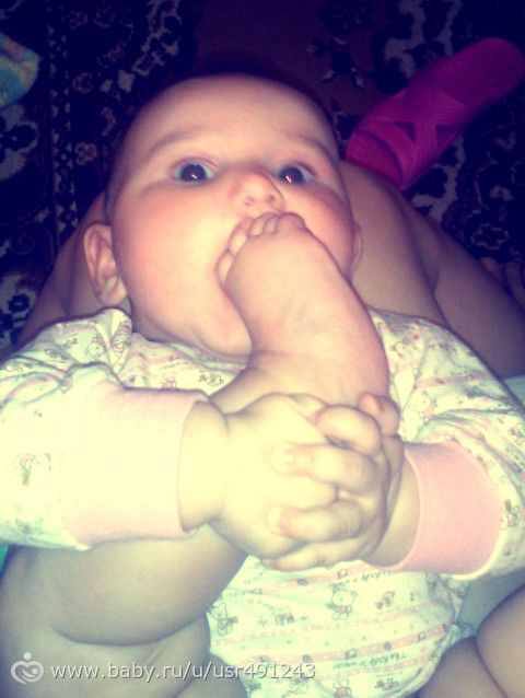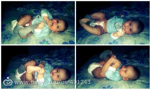 Доча вчера из положения полуежа (во время бодрствования слегка её приподнимаю на подушке) села на попу, голова перевешала, и она чуть не клюнула носом. Она постоянно пытается сесть из положения лежа. Даже ночью, во сне. За то переворачиваться она не любит. Умеет, может, знает как, но не хочет.В лучшем случае 1-2 в день перевернется сама. Её постоянно надо подталкивать на это дело. Сама она переворачивается в основном ночью, когда проснется и начинает играть сама с собой. Снимает носки, крутится в разные стороны и тд....