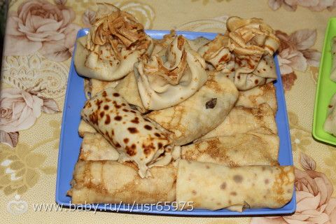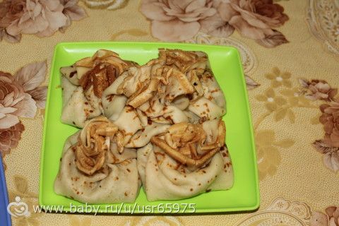 Делала просто заворачивала и делала мешочки с этой же начинкой, на фото нет, утром купила лук зеленый и обвязала каждый мешочек луком зеленым, можно сыром косичкой, кому как вкуснее и что есть дома)