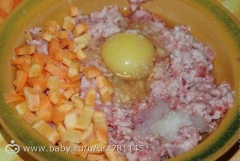 Соединить фарш (лучше брать свиной, так как он жирнее, зразы получатся более сочными), яйцо, нарезанную морковь, лук. Посолить и перемешать.