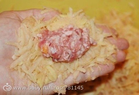 Взять в руку немного натертого картофеля и хорошенько отжать, распределить на ладони отжатый комочек. Положить начинку.