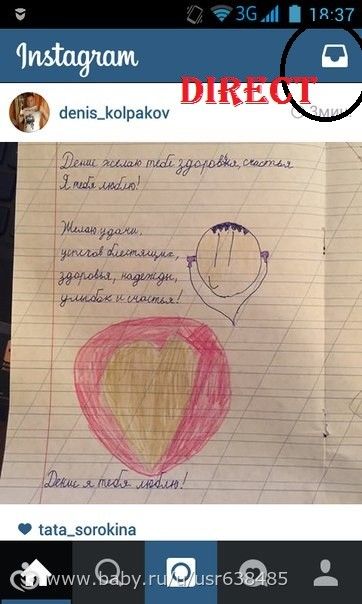 Как мне зайти в директ? Где оно вообще находится? Куда нажимать? Не могу понять. Туда мне фото отправили хотела посмотреть.