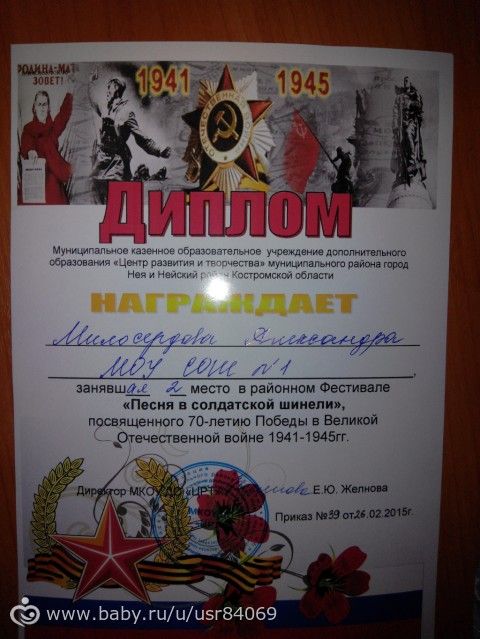 А вечером Саша еще одну грамоту принесла, сегодня был конкурс песни, надо сказать оригинальностью наша администрация не отличается, зачем придумывать новую грамоту, когда есть образец))))