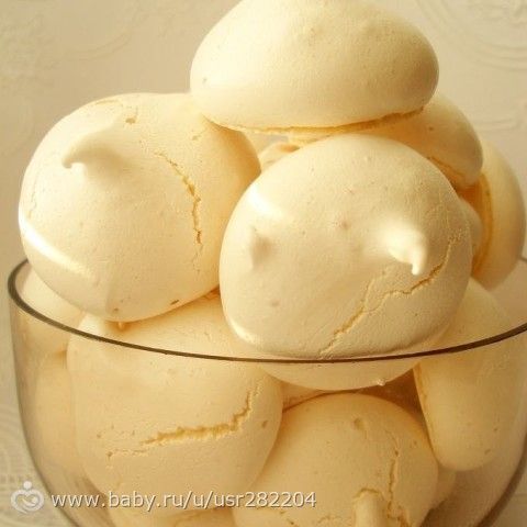 «Домашнее безе» Ингредиенты: - 2 охлажденных яичных белка - 100 г сахарной пудры - лимонный сок Приготовление: 1. Белки взбить с сахарной пудрой в густую массу, с добавлением нескольких капель лимонного сока. 2. Выпекать при 100 градусов 1 час в режиме конвекции и еще на 1 час оставить для остывания в духовке.