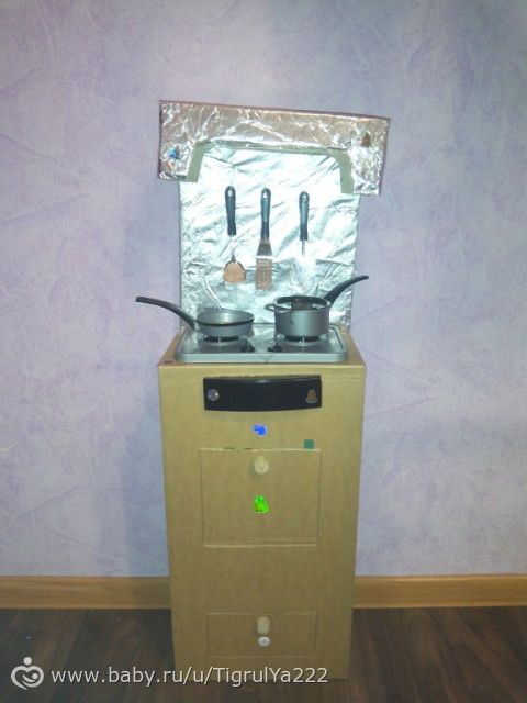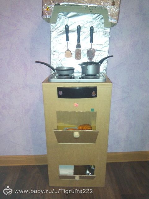Кухня на скорую руку. Продукты из крашенного соленого теста. В самой кухне: вытяжка. Варочная поверхность. Духовой шкаф. Отделение для хранения посуды. Крючки и набор лопаточек.