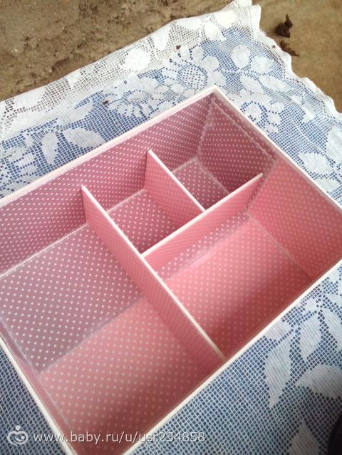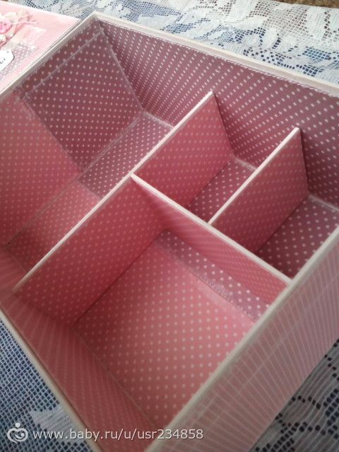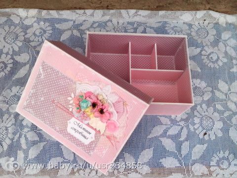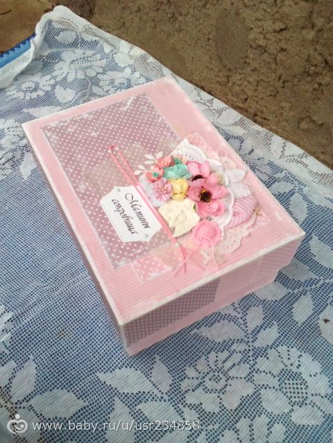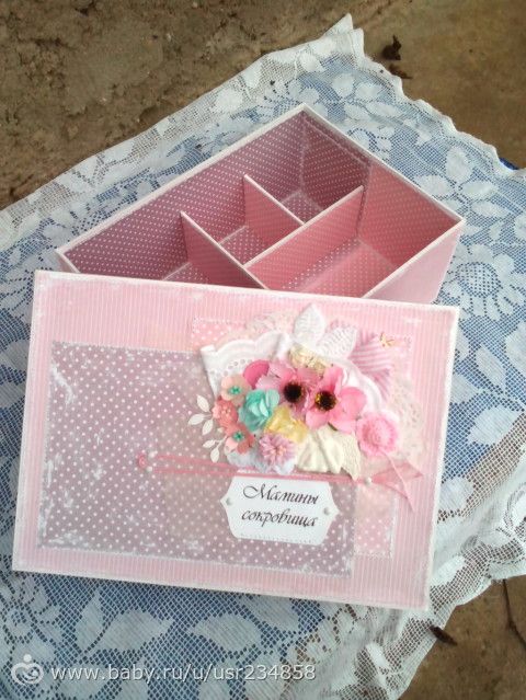 Это коробка «Мамины сокровища». ))))))))))) Только не такая, как обычно делают все. Я решила не ограничивать фантазию мамы коробочками для какого-то одного предмета внутри, а сделать отделы. А мамочка сама может решить куда и что покласть. ) Лично у меня остался чистый подгуз единичка малюсенький, первая кофточка масюсенькая, бутылочка… и в маленьких коробочках это б не вместилось. Поэтому решила сделать так. )