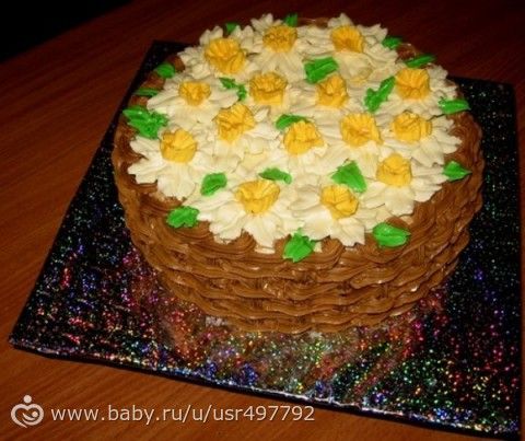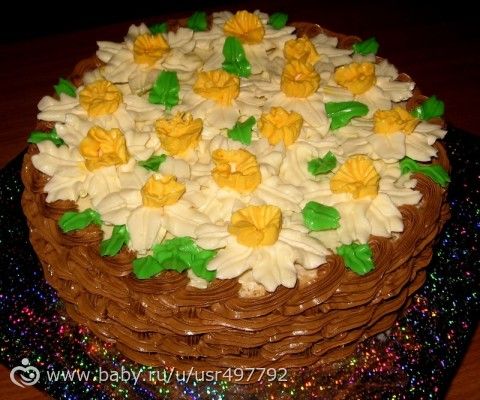 Вот такая получилась корзиночка с нарциссами. Классический бисквит, крем шарлотт.
