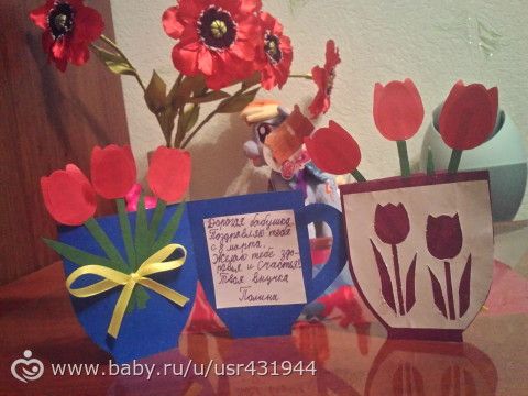 Решили с дочкой сделать своими руками открытки на 8 марта. Вот что у нас получилось, тюльпанчики в кружках, вид внутри и снаружи