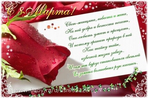 Пусть сегодня ваша душа до краев наполнится светом, теплом и радостью от искренних пожеланий, нежных цветов, приятных подарков! Пусть ласточки вьют гнезда над вашими окнами и несут в дом благополучие и взаимопонимание, а первые лучи весеннего солнышка укажут на счастливую тропинку вашей судьбе!