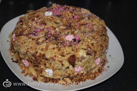 7. Торт «собрать» на блюде, обильно промазывая каждый корж кремом. Крема много, поэтому не экономьте, пускай стекает по бокам — тогда коржи хорошо пропитаются. Один корж, наиболее румяный, раскрошите и посыпьте им верхушку и бока готового торта.