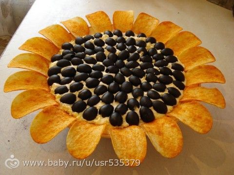 самый верхний слой- желток. ну украшено понятно: оливки и чипсывсё перемешать с майонезом и будет вкусно или слоями