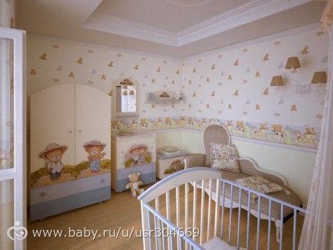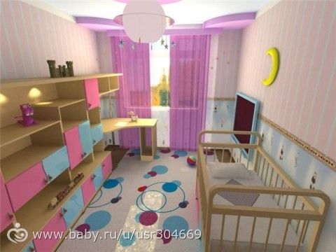 у нас простенько, светлые однотонные стены, потолог колубой со звездочками, и мебель в тон стен, акцент на яркые игрушки и тюль