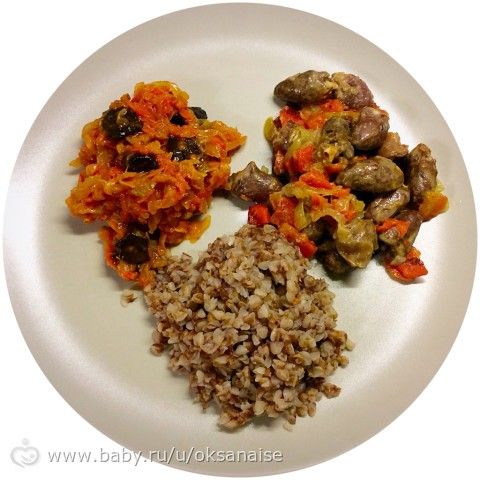 Гречка, куриные желудочки с сердечками и луком, морковкой и домашняя солянка