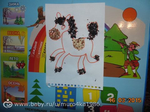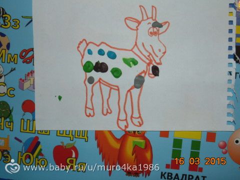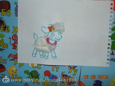 потом наклеили барашку, козу и козленка, совместно искали животных и вместе приклеивали)